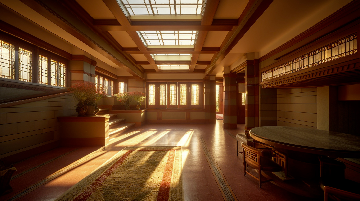 prompt: /subjective perspective, interior, frank lloyd wright’s martin house, second floor, volumetric lighting, high definition, cinematic, photographic hyper realistic, –q 4 –s 750 –upbeta –s 250 –v 5 –upbeta –s 250 –v 5 –ar 16:9
